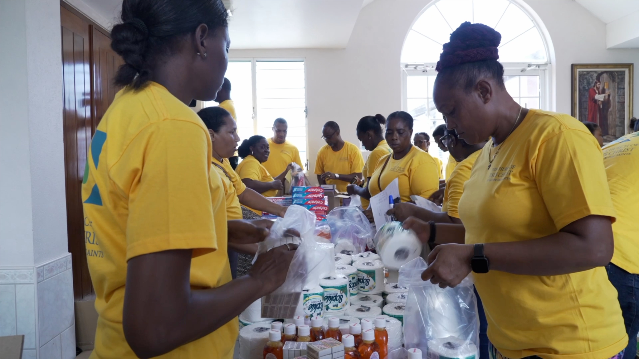 Volunteers in Savana-la-Mar, Jamaica helped prepare and distribute over one thousand emergency packages containing non-perishable food, bottled water, and basic hygiene items.© 2025 by Intellectual Reserve, Inc. All rights reserved.In Savanna-la-Mar, the community noted that The Church of Jesus Christ was the first organization to reach out and offer help after the disaster. On Sunday, November 3, even with the meetinghouse in poor condition, members gathered to worship and express their faith and devotion to Jesus Christ. Elder Corbitt presided over the spiritual meeting in the Savanna-la-Mar Branch, where he emphasized:“The Lord has aligned the keys of His power to identify those in need. Thus He built His Church—to go and rescue His sheep.” With faith and hope, members transformed their worship into action, going out to bless their community and to testify—through their deeds—of the love of the Savior, Jesus Christ.
